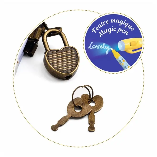 Er zit een magische pen bij die met onzichtbare inkt schrijft, zodat niemand zomaar kan zien wat erin staat. Door er met de UV-lamp op te schijnen, kun je de tekst weer tevoorschijn toveren!