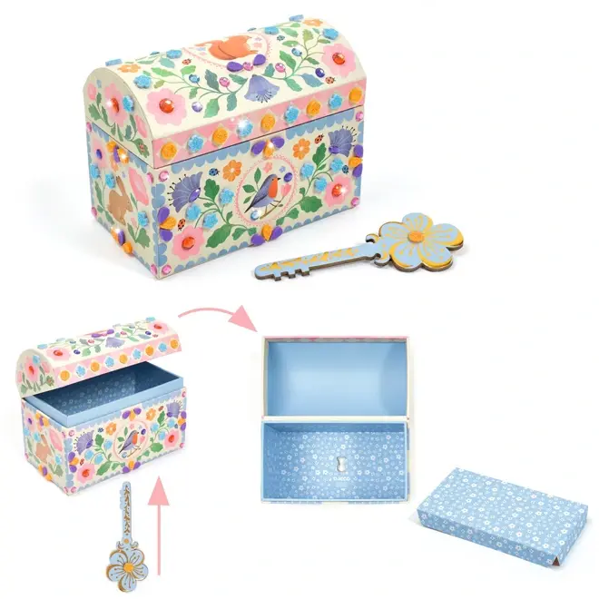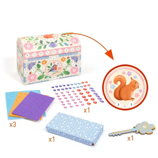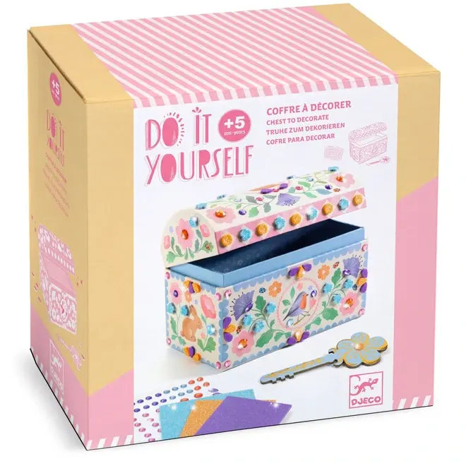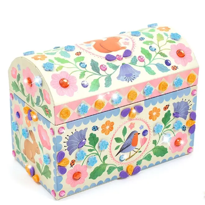 Met deze knutselset van Djeco versieren kinderen hun eigen schatkistje met meer dan 150 glinsterende mozaïekstickers en strassteentjes. Alles blijft goed plakken, dus geen gedoe met lijm.