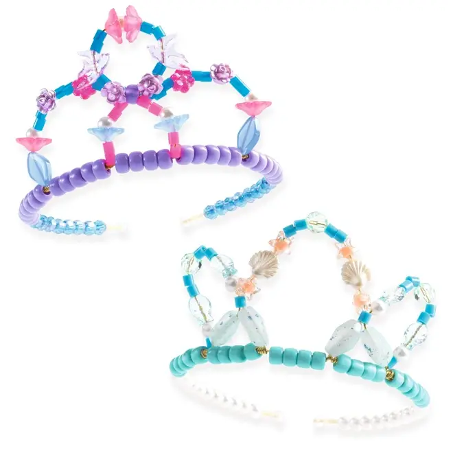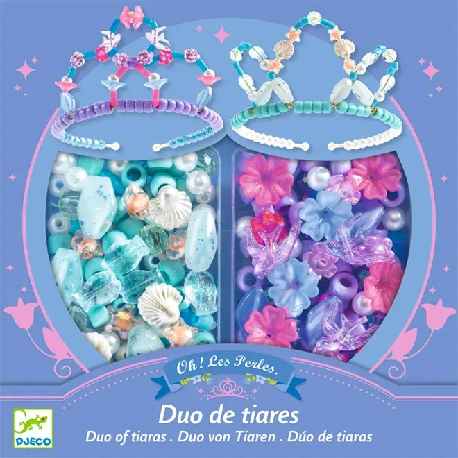 Met deze set van Djeco maken kinderen twee betoverende tiara’s in blauw/groen en paarse tinten. In de doos zitten 240 verschillende acrylkralen, twee goudkleurige haarbanden en soepel metallic garen om alles stevig en mooi vast te maken.