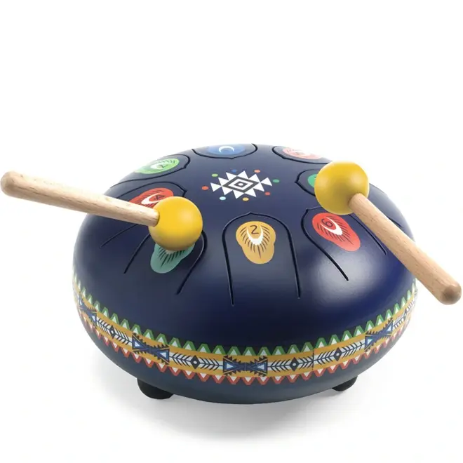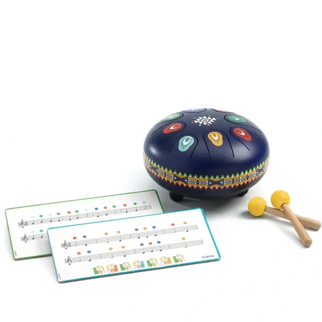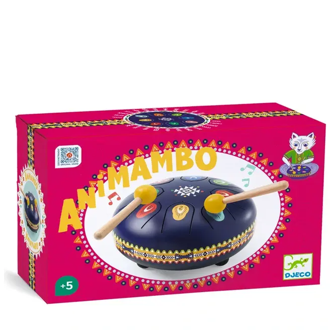 De Djeco Animambo metalen trommel heeft 8 delen die precies overeenkomen met muzieknoten. Kinderen kunnen met de meegeleverde stokjes op de gebieden kloppen en zo de mooiste geluiden maken.
