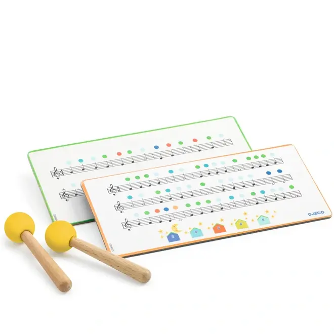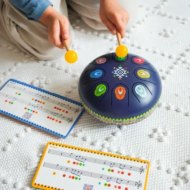 Het leuke is dat het instrument super makkelijk te bespelen is. Bij de trommel zitten maar liefst 4 muziekstukken. Elke noot heeft een gekleurde sticker met een nummer, waardoor kinderen makkelijk de muziekstukken kunnen volgen.