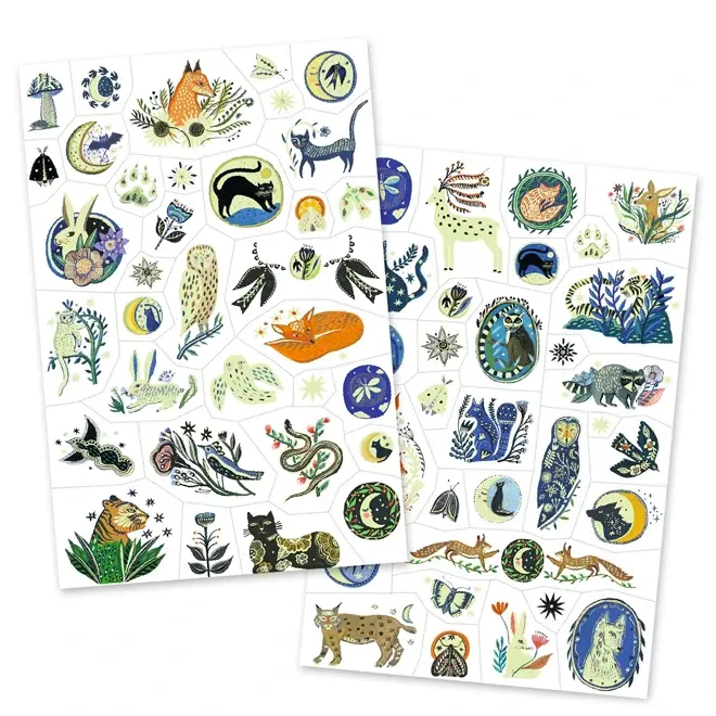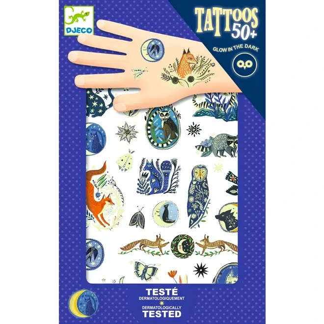 Met deze Djeco tattoos nachtdieren maak je kinderen blij. Op de twee vellen staan lieve diertjes. Sommige stukjes lichten op in het donker, wat zorgt voor een cool effect.