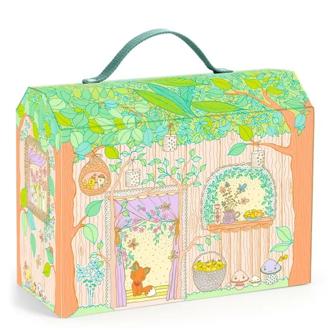 De koffer is gemaakt van duurzaam FSC-karton en heeft een stevige stoffen handgreep, zodat kleine avonturiers hun boshuis overal mee naartoe kunnen nemen. De handige magneetsluiting zorgt ervoor dat alles netjes bij elkaar blijft.