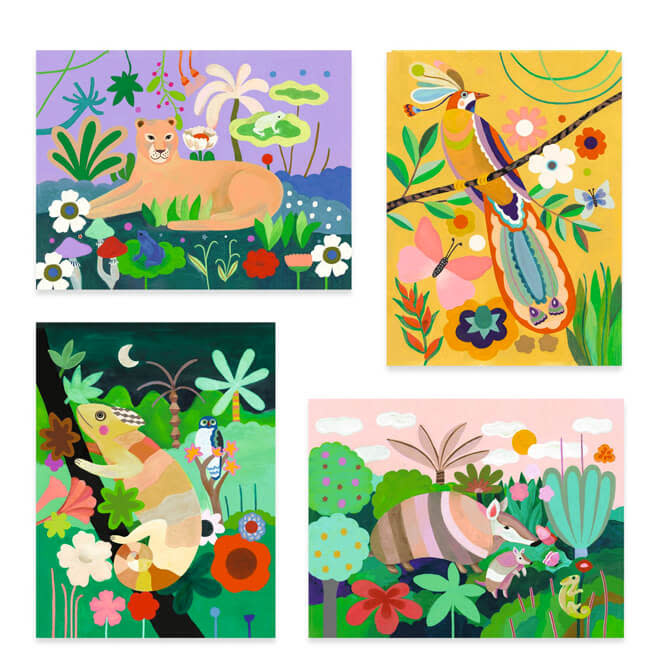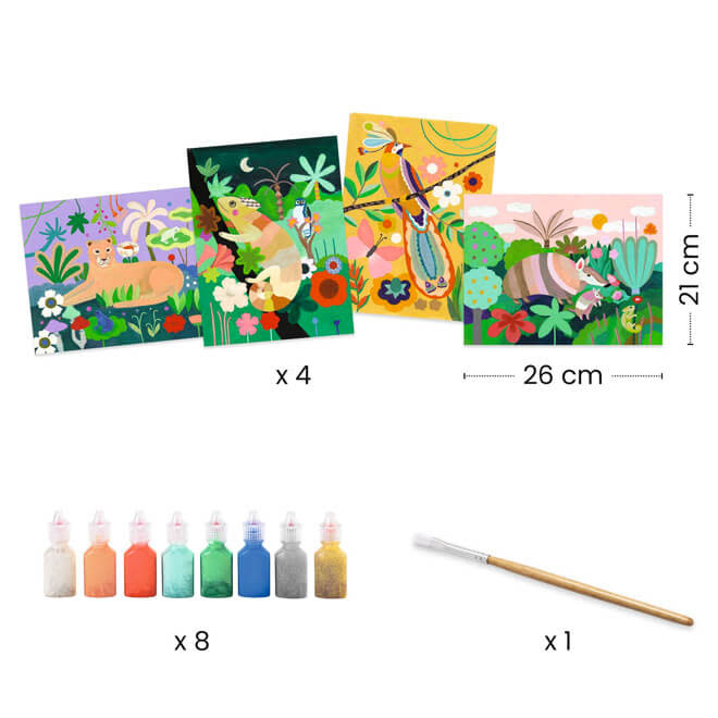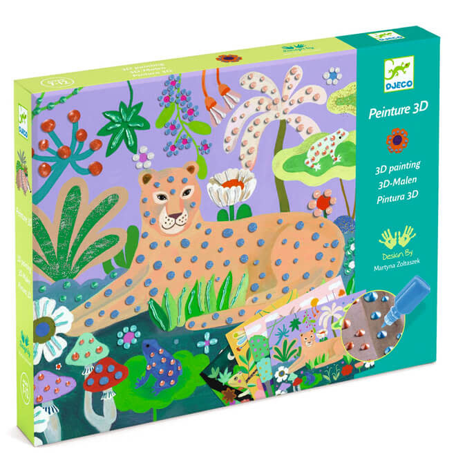 Djeco Tropisch Woud is een knutselset waarbij je vier schilderijen met 3D verf kunt versieren. Je gebruikt een penseel en speciale 3D-verf om lijnen en stippen te maken die echt uit het papier springen!