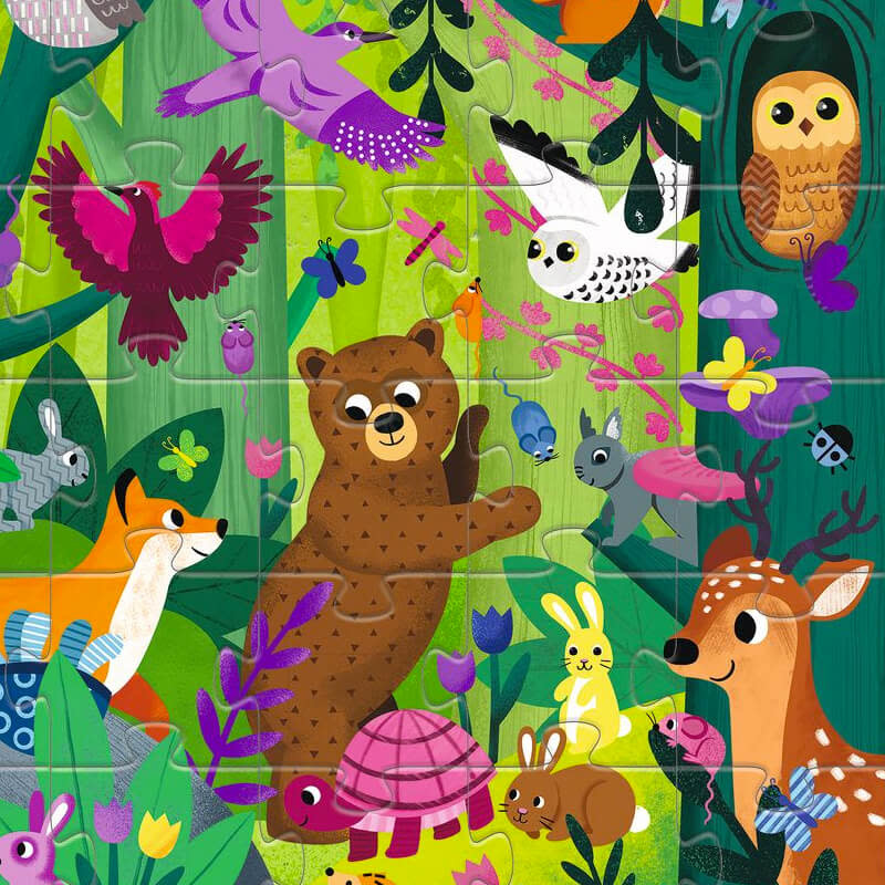 Als de puzzel gelegd is kan het kind een spel van "zoek en vind" doen, waarbij hij of zij de dieren in de aangegeven kleuren moet vinden. Oftewel twee in één: een puzzel en observatiespel!