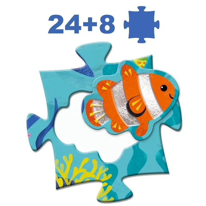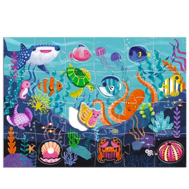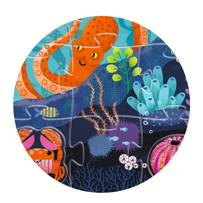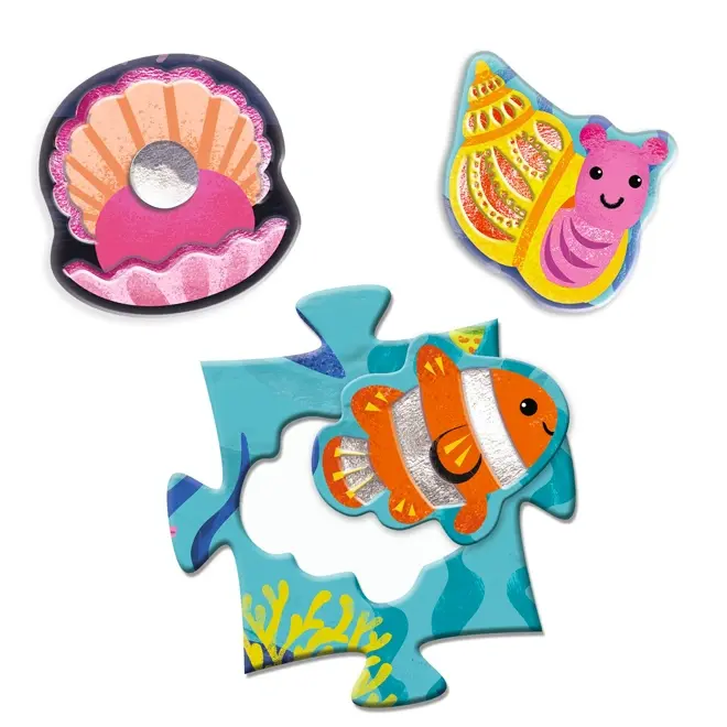 De Djeco vloerpuzzel zee bestaat uit 24 gewone puzzelstukken en 8 bijzondere stukken van glanzende zeedieren zoals vissen, zee-egels, heremietkreeften, krabben en schelpen. Door de verschillende texturen voelt elk dier anders aan, wat zorgt voor een extra sensorische ervaring.