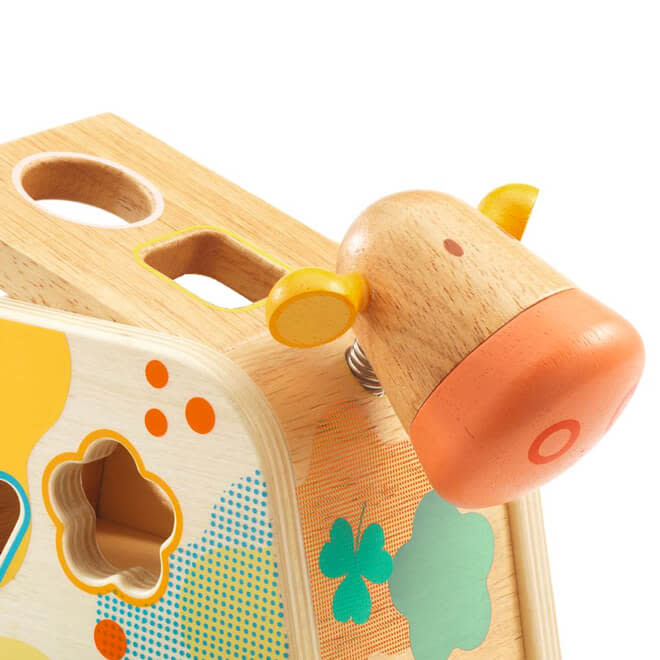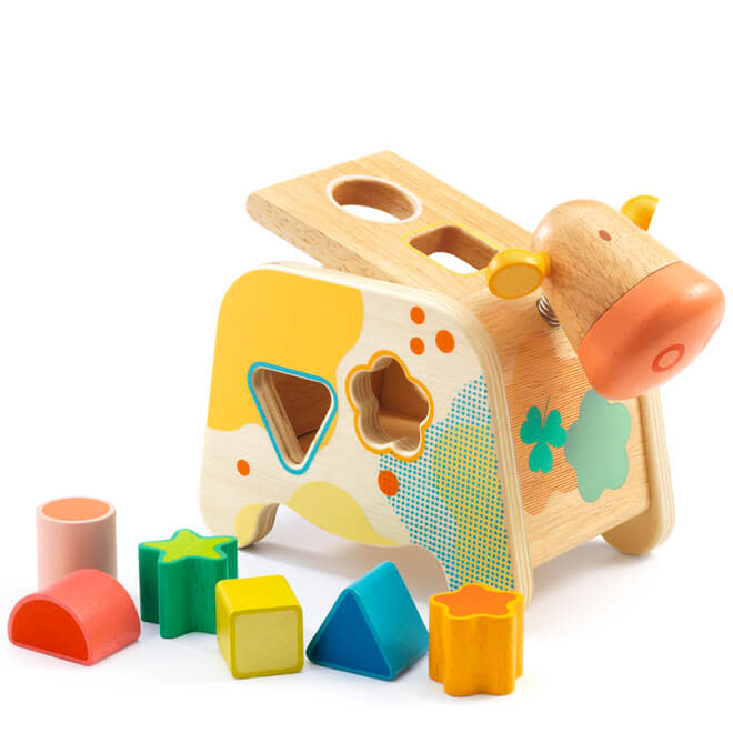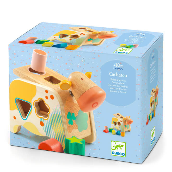 Djeco Cachatou is een vormenstoof met het uiterlijk van een koe, gemaakt van stevig hout in zachte kleuren. De Djeco koe vormenstoof bevat 6 gekleurde, geometrische vormen welke via het juiste gat in de vormendoos gedaan moeten worden.