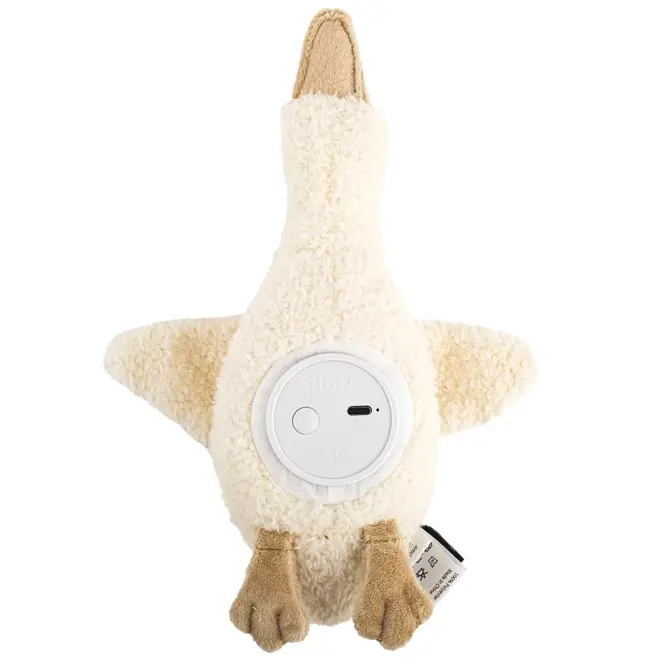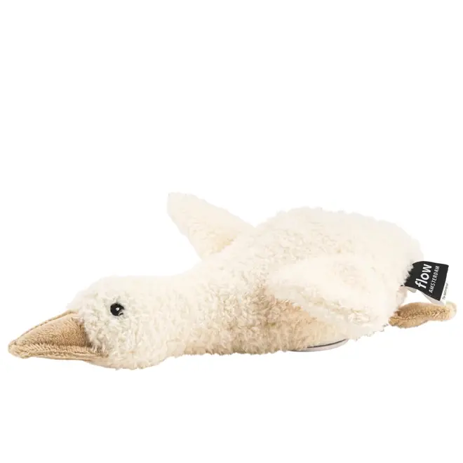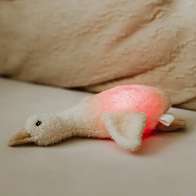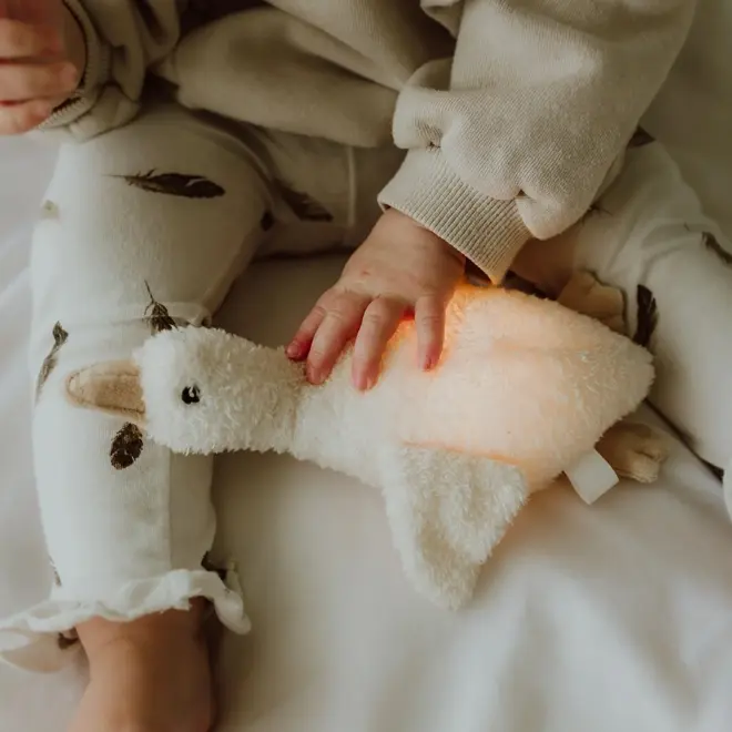 Gans Liva van Flow Amsterdam is een superzachte knuffel en nachtlampje in één, perfect voor kinderen die wat extra comfort zoeken in het donker.