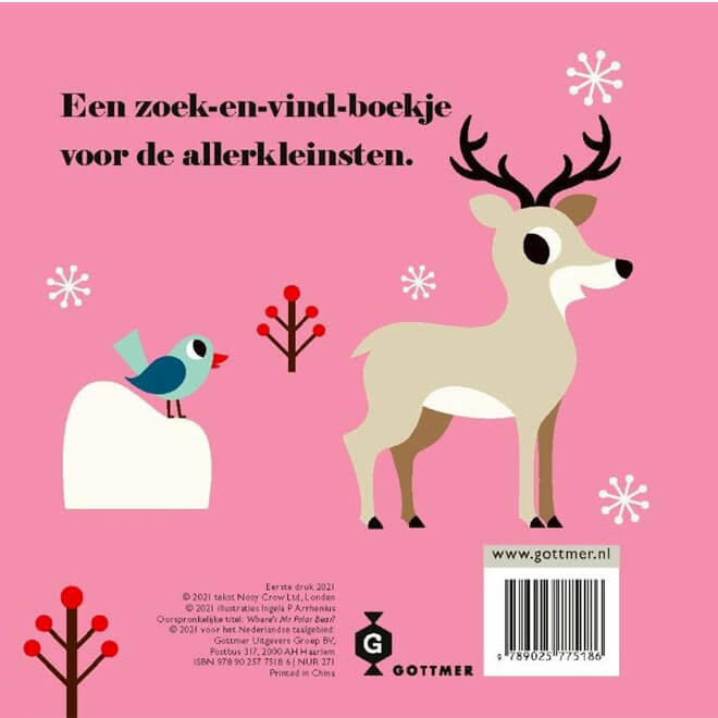 ‘IJsbeer, waar ben je?’ van illustratrice Ingela P Arrhenius is een stevig kartonboek met vilten flapjes. Allerlei dieren uit het hoge Noorden zitten verstopt achter de flapjes van vilt. Kun je de ijsbeer, rendier en de poolhaas vinden? Een zoek-en-vind-boekje voor de allerkleinsten, met als verrassing een spiegeltje op de laatste pagina wat kleintjes super leuk vinden!