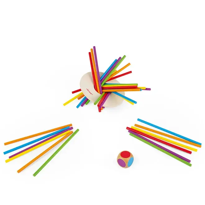 Janod Crazy Sticks bevat 36 stokjes, een schijf en een houten dobbelsteen. Je kunt spelletje met maximaal 6 spelers tegelijk spelen. Wie beheerst de kunst van het balanceren het beste?
