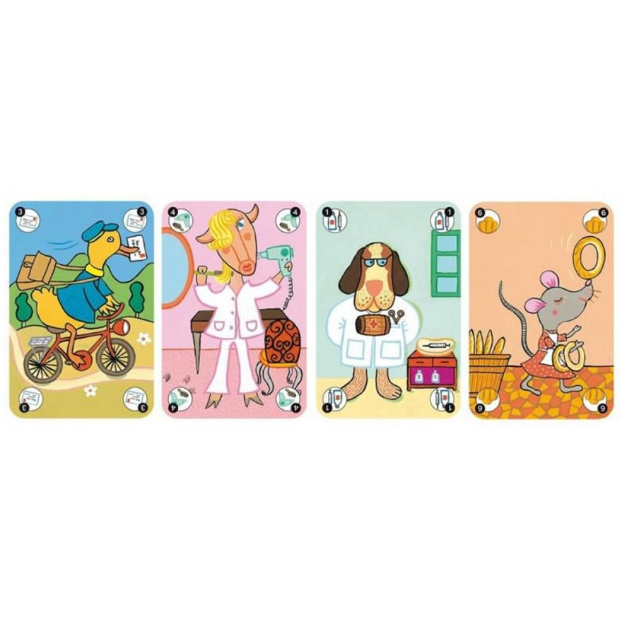 Grappig kwartet spelletje van dieren en hun beroep; zo is er de familie bakker, brandweer, tuinman, kapper, enz. Wat dit kwartspel anders maakt dan andere kwartetspelletjes, is dat een kwartet bestaat uit 6 kaarten in plaats van 4!