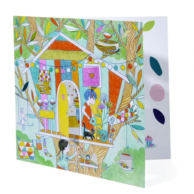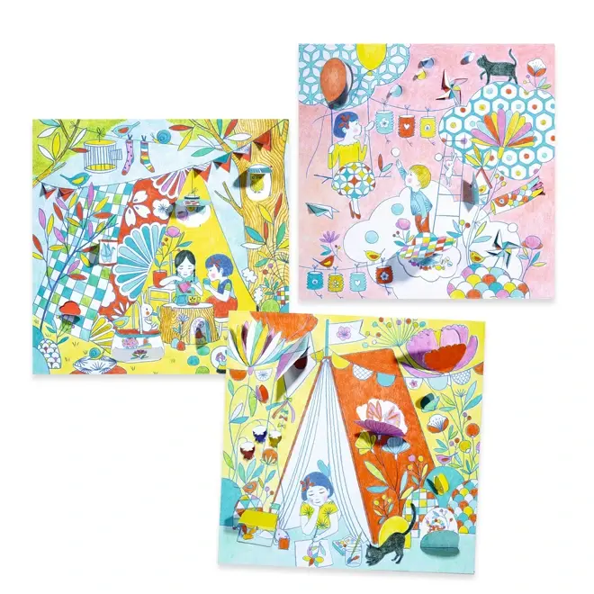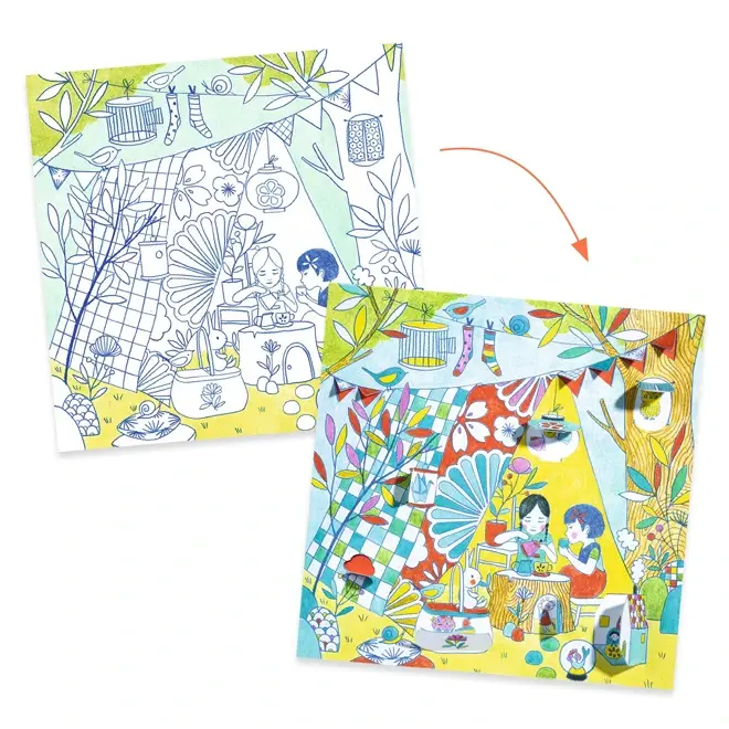 Bij De hutten van Nina van Djeco kleur je niet alleen de plaat zelf, maar ontdek je ook wat erachter schuilgaat. Kinderen van 5 tot 8 jaar kunnen de kleine raampjes openvouwen en daarachter allerlei verrassingen inkleuren.