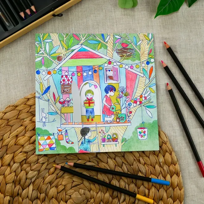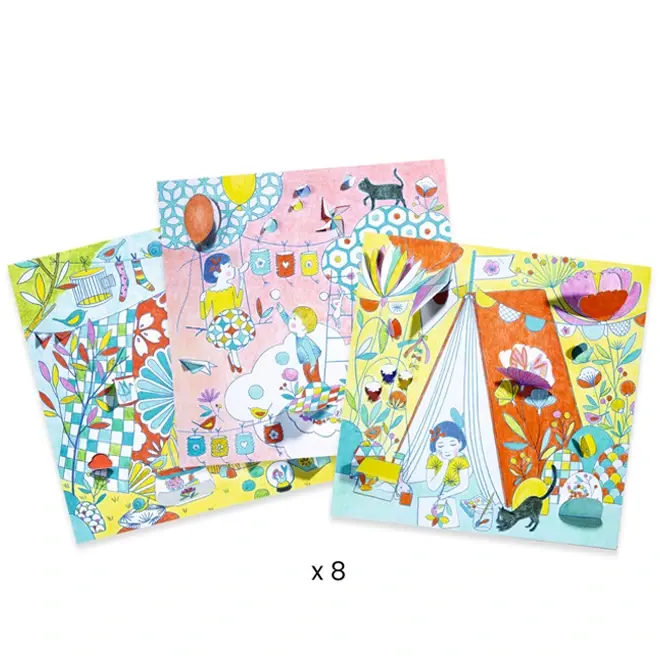 De illustraties hebben fijne uitsparingen en flapjes die zorgen voor een beetje diepte en een speels 3D-effect. In totaal zitten er acht dubbele kleurkaarten (4 kaarten x 2) in de set, elk met leuke details om te ontdekken en in te kleuren.