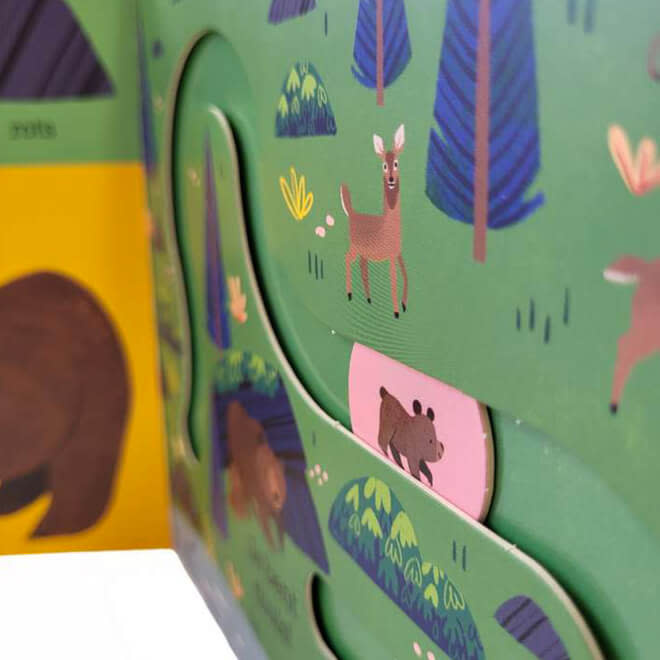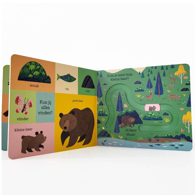 In 'Kom je thuis, klein konijn? kunnen kleintjes met bewegende schuifjes in elke spread de dieren veilig thuisbrengen naar hun ouders door het pad met hun vinger te volgen.