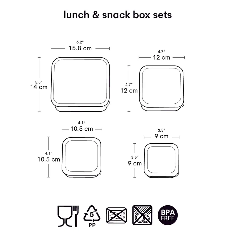 Lunch box: 15,8 x 14 x 7 cm, grote snack box: 12 x 12 x 5,5 cm, middelgrote snack box: 10,5 x 10,5 x 5 cm, kleine snack box: 9 x 9 x 4,5 cm.