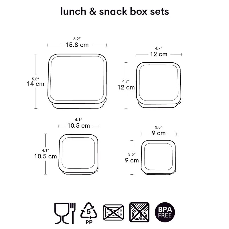 Lunch box: 15,8 x 14 x 7 cm, grote snack box: 12 x 12 x 5,5 cm, middelgrote snack box: 10,5 x 10,5 x 5 cm, kleine snack box: 9 x 9 x 4,5 cm.