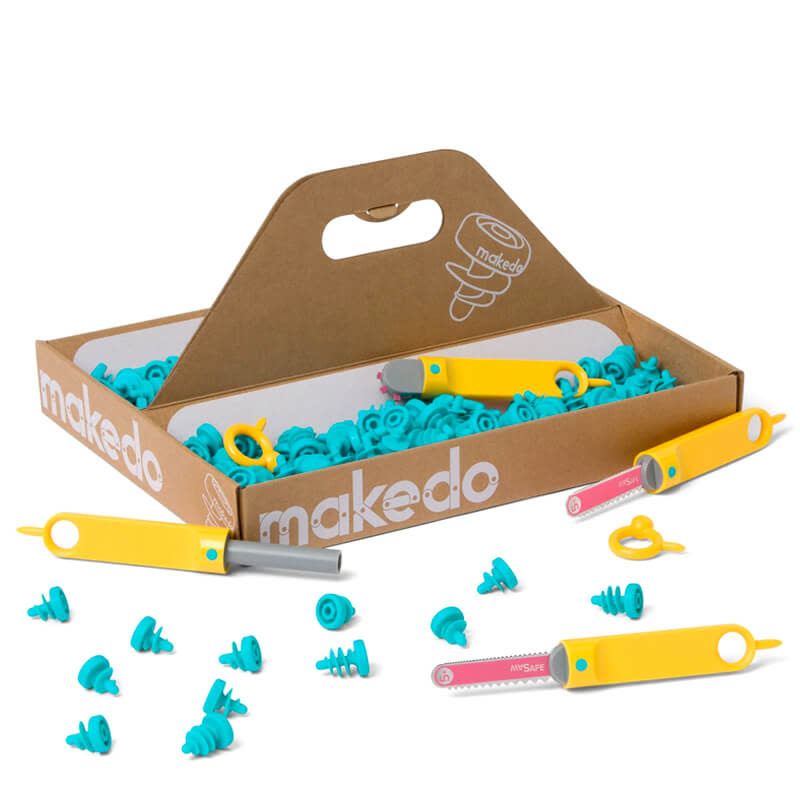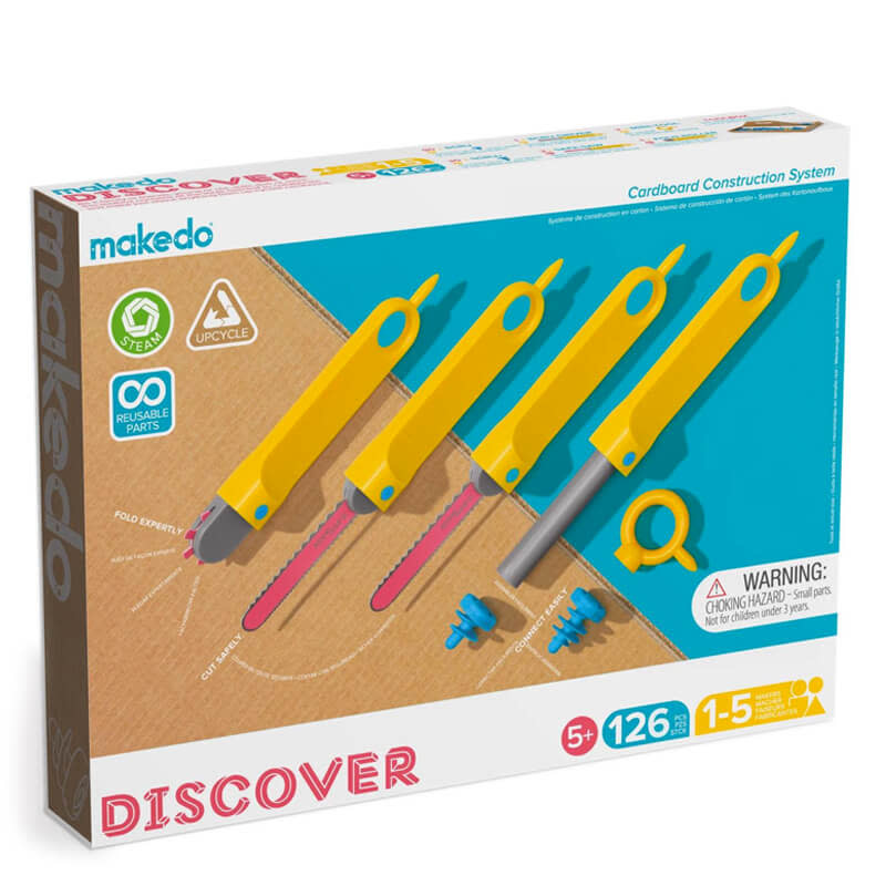 Dit Makedo Discover set bevat genoeg om met 1 tot 5 makers aan de slag te gaan. Ideaal voor in de klas, thuis of op een buitenschoolse opvang. Deze Makedo toolkit is 126-delig en bevat 2 veilige kartonzaagjes, 1 schroevendraaier, 1 vouwlijn roller, 90 schroeven, 30 schroeven XL en 2 mini tools.