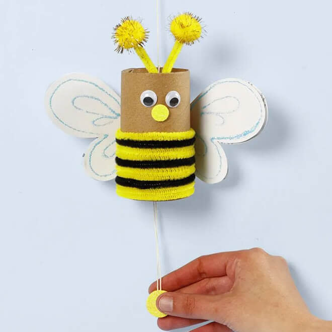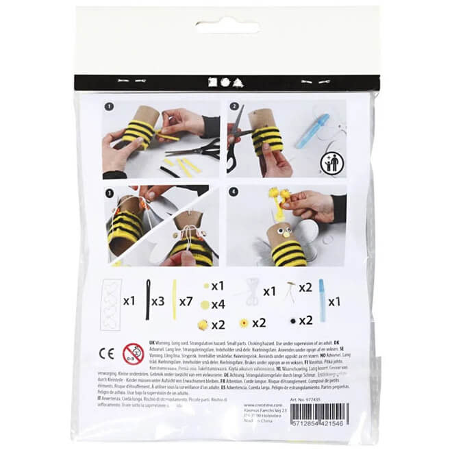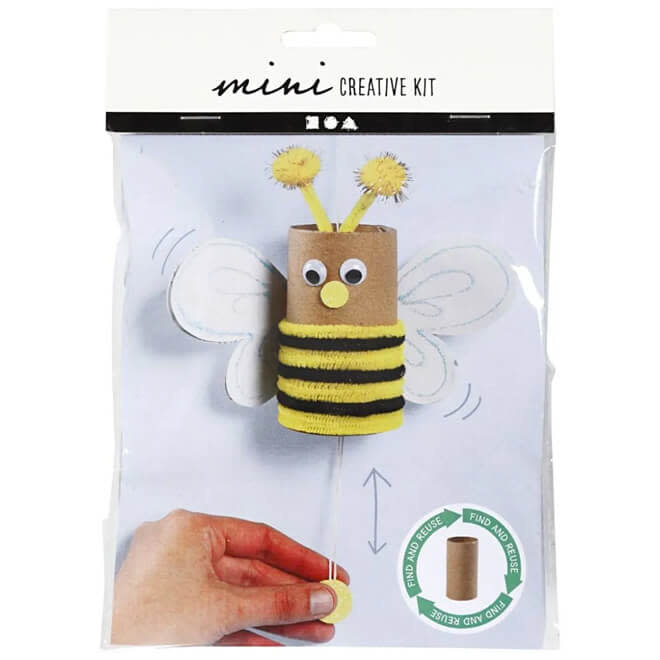 Een vrolijke mini knutselset voor het maken van een bij met bewegende vleugels. Snijd de verpakking in stukken om de vleugels van de bij te maken en voeg je eigen lege toiletrol toe; zo hergebruik je ook afval materialen.