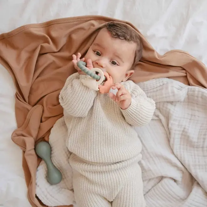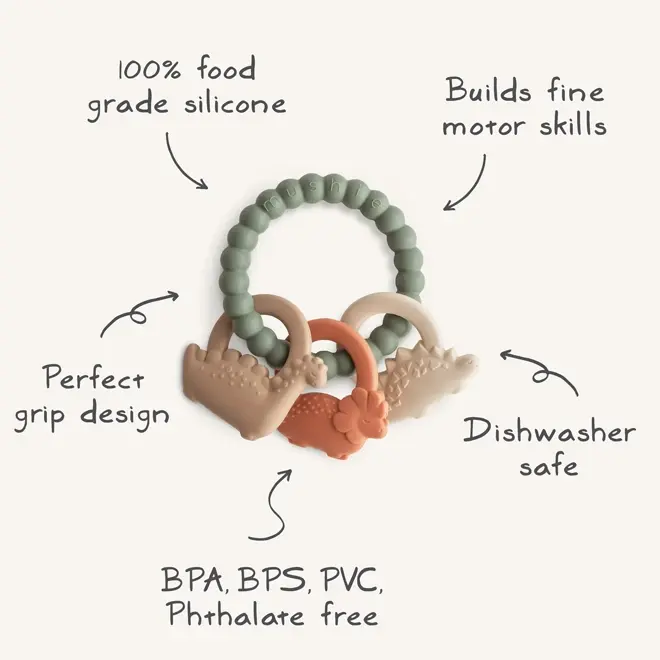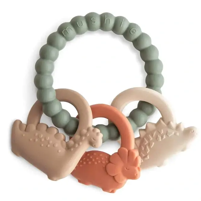 Deze stijlvolle bijtring van Mushie is gemaakt van 100% voedselveilig silicone. Perfect voor baby's vanaf 3 maanden die hun eerste tandjes krijgen. Het zachte materiaal geeft precies de juiste weerstand voor pijnlijk tandvlees.