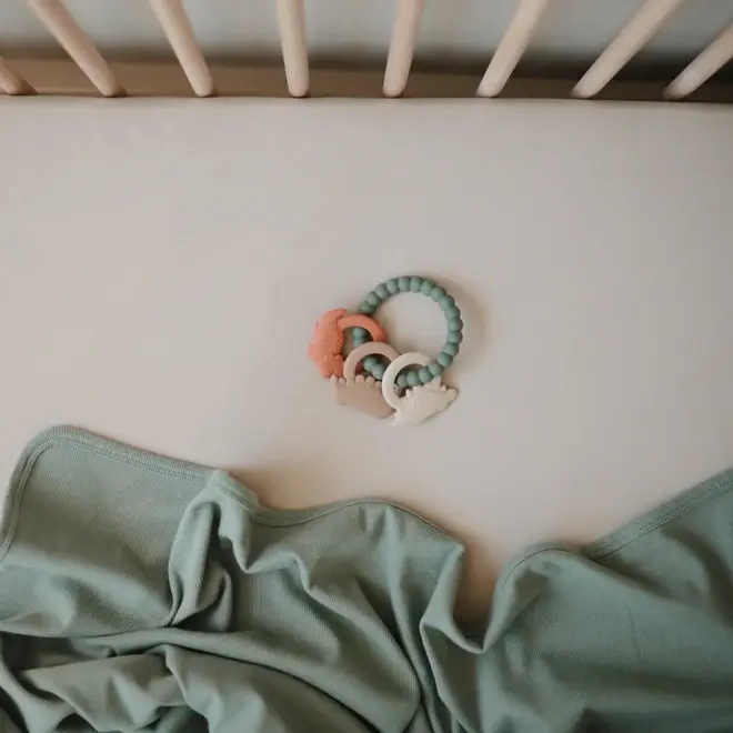 De speelse dino's in aardse kleurtinten zijn niet alleen leuk om naar te kijken, maar ook om te voelen. De ring heeft een patroon dat extra zintuiglijke prikkels geeft en je baby uitnodigt om op te gaan ontdekken.