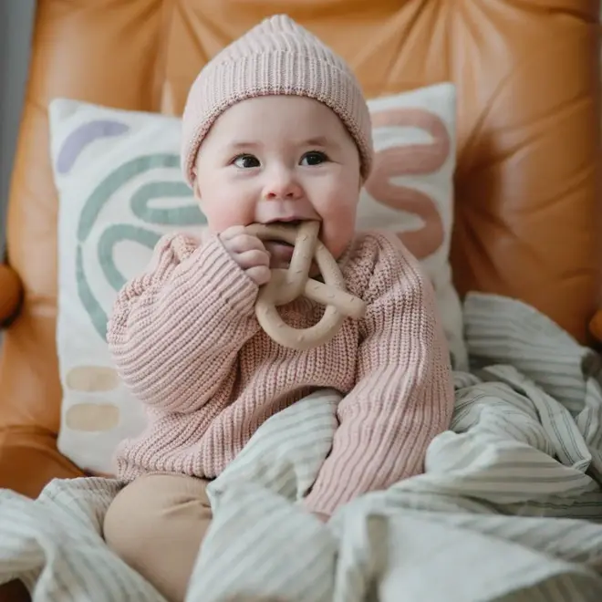 Last van doorkomende tandjes? Deze te gekke pretzel bijtring van Mushie is dé oplossing. Het zachte siliconen geeft direct verlichting aan pijnlijk tandvlees. De bijtring is perfect voor kleine handjes om zelf vast te houden en te ontdekken.