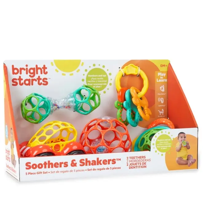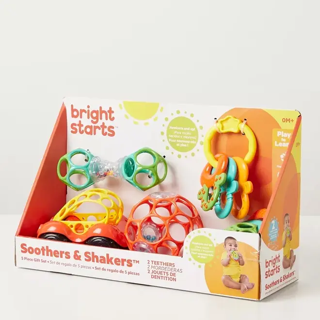 De Oball Soothers & Shakers Giftset bevat verschillende Oball speeltjes die elk op hun eigen manier de zintuigen van je baby stimuleren. Van zachte rammelaars tot speeltjes met verschillende texturen - er zit voor elk ontwikkelingsmoment iets bij.