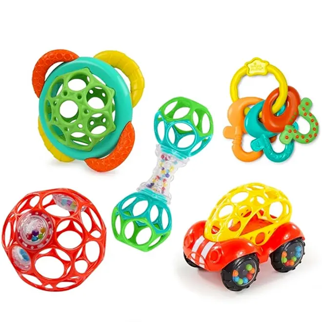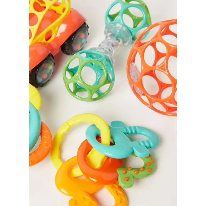 Alle items in de set hebben het kenmerkende gebruiksvriendelijke Oball-ontwerp met flexibele gaten, waardoor ze perfect zijn voor kleine handjes. De verschillende speeltjes stimuleren de motorische vaardigheden en zintuiglijke ontwikkeling van je baby.