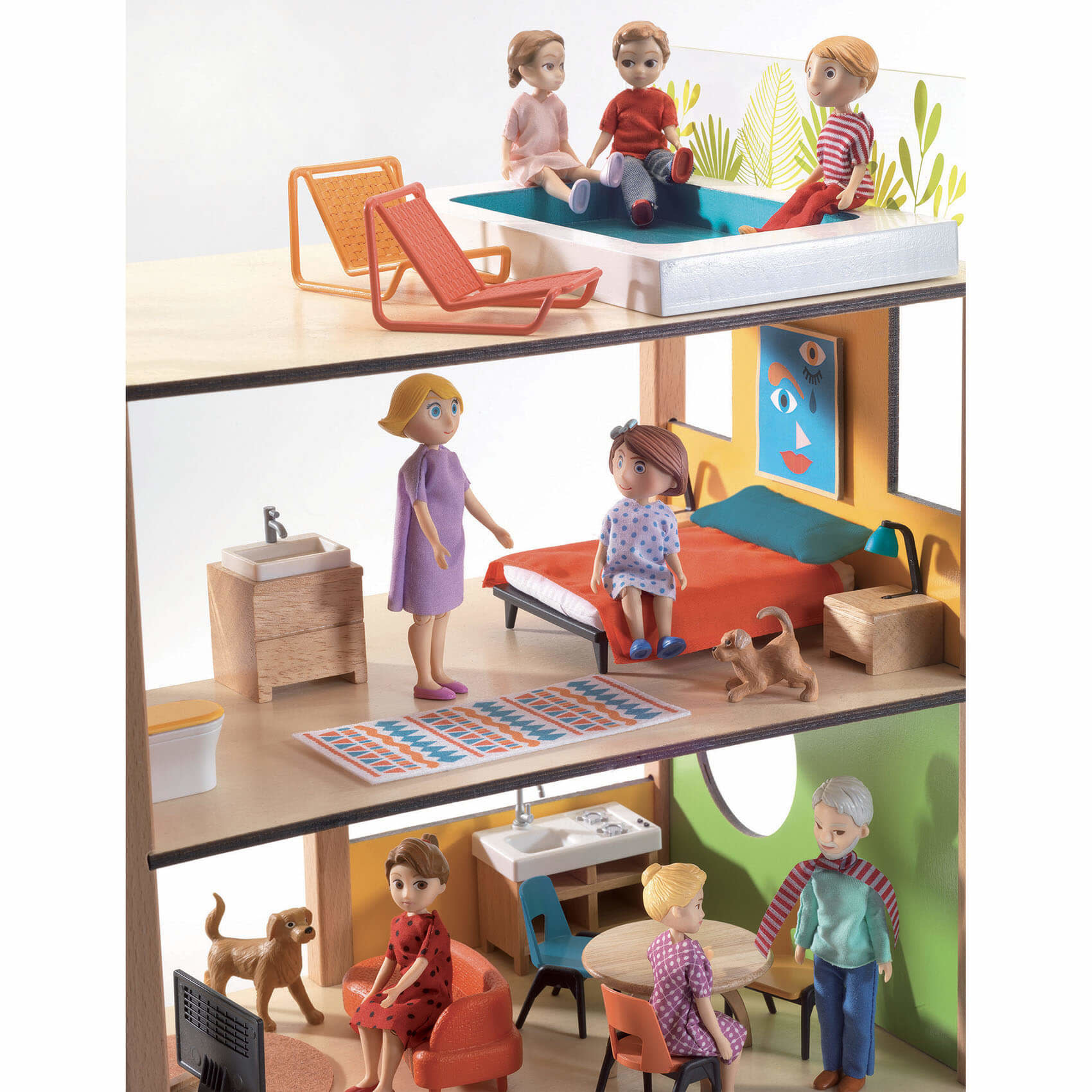 Djeco poppenhuis City House is een modern poppenhuis in hout en plexiglas, met 3 verdiepingen en een zwembad op het dak. Luxe hoor!
