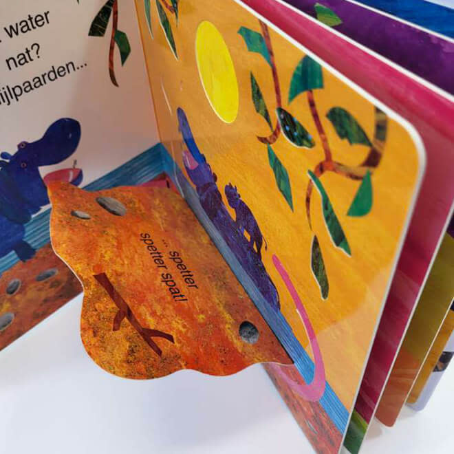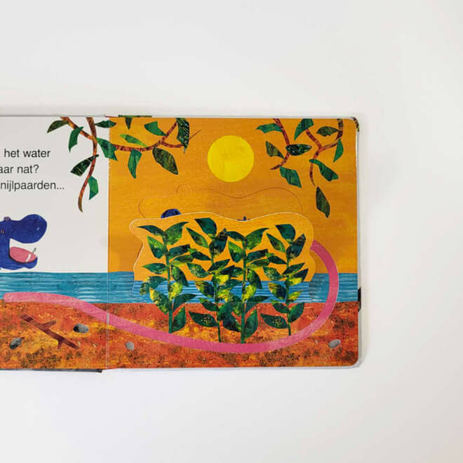 Op elke spread leidt een verzonken spoor, dat dreumesen en peuters met hun vingertoppen kunnen volgen, naar een grote flap waarachter een dier is verstopt. Ga met Rupsje Nooitgenoeg mee op safari en zoek de wilde dieren.
