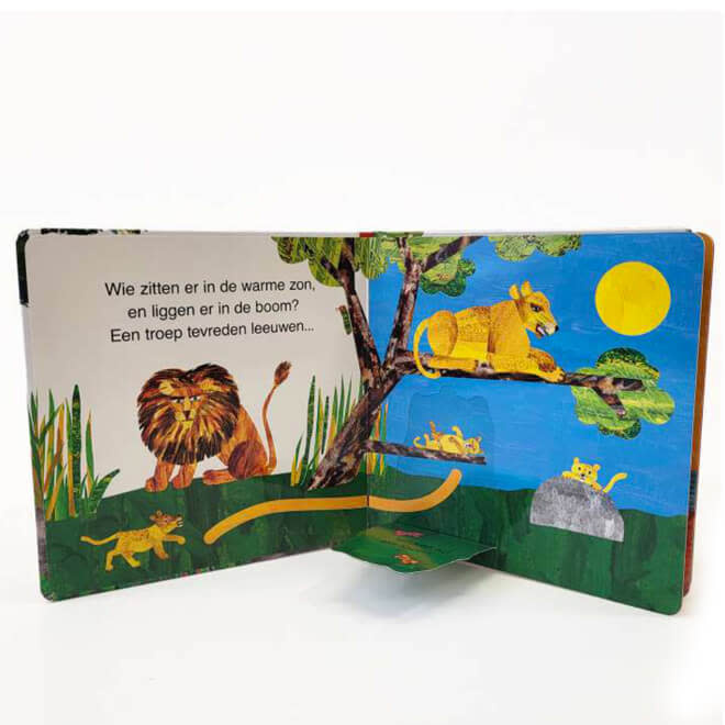 In het stevige zoekboek vol flappen 'Rupsje Nooitgenoeg zoek & vind - Wilde dieren': vind je de prachtige illustraties van Eric Carle. Van olifanten tot leeuwen en van giraffen tot zebra's, allemaal spatten ze in warme kleuren van de pagina's.