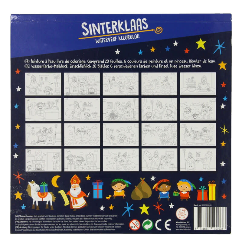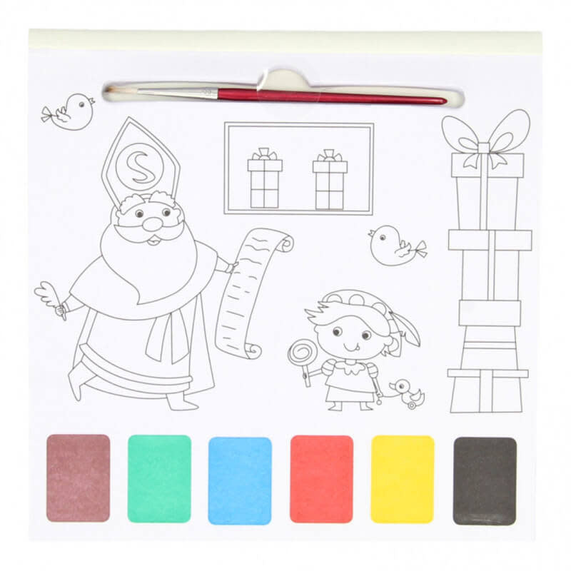 Het Sinterklaas Waterverf Kleurblok bevat maar liefst 20 leuke Sinterklaas kleurplaten met afbeeldingen van Sinterklaas, zijn Pieten, cadeautjes en andere Sinterklaasfiguren.