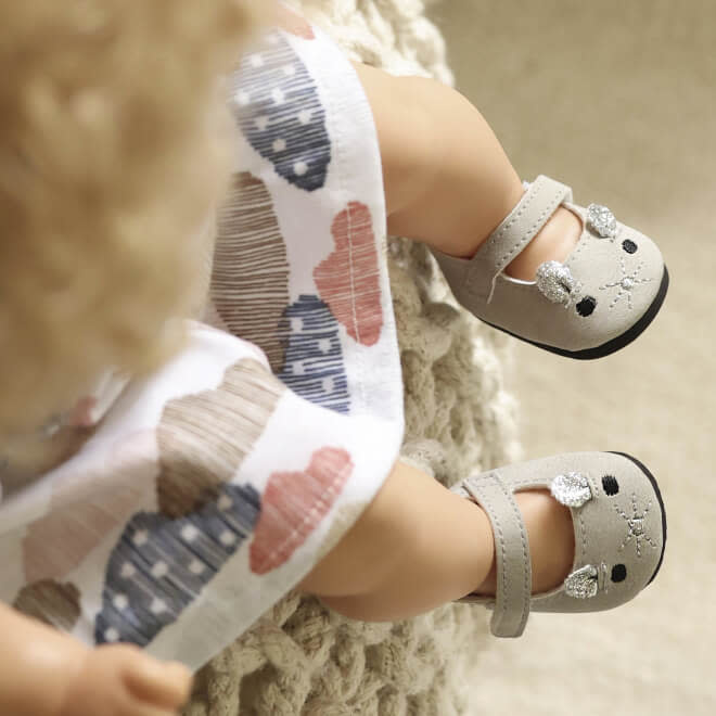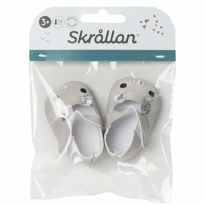 Hoe schattig zijn deze poppenschoentjes van het Zweedse merk Skrallan? De poppen schoenen hebben een lichtgrijze kleur met zilveren details en maken de outfit van je pop helemaal af!