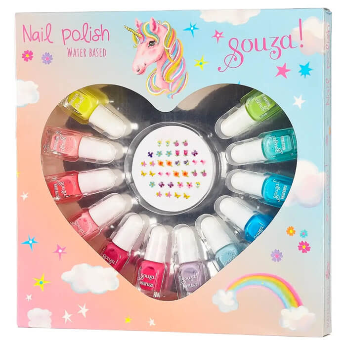 Dit Souza nagellak cadeauset is leuk om te geven en om te krijgen. De set bevat namelijk 12 mini potjes nagellak in alle kleuren van de regenboog en nagelstickertjes!