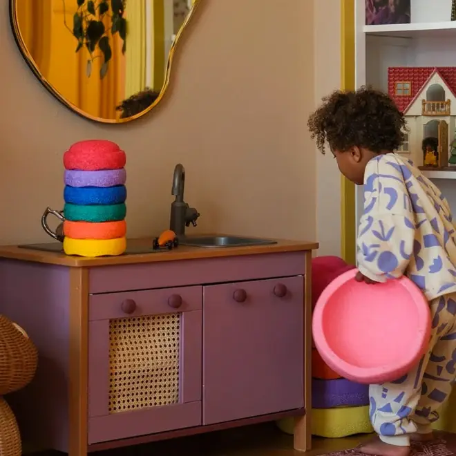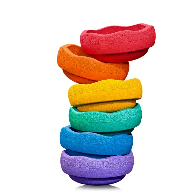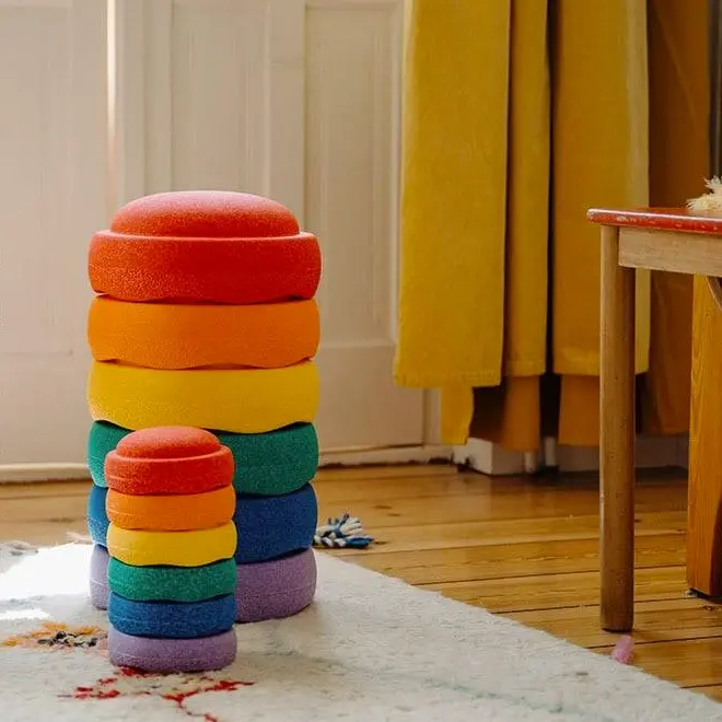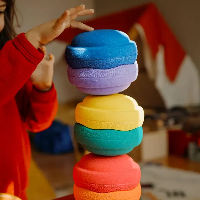 Deze mini stapelstenen zijn perfect voor kleine handjes. Met een diameter van 13,5 centimeter zijn ze makkelijk vast te pakken en te verplaatsen. De Stapelstein Mini Rainbow set bestaat uit zes regenboogkleuren: rood, oranje, geel, groen, blauw en paars.